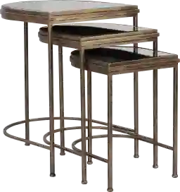 The Brineton is a beautiful set of three nesting tables with an elegantly curved hand forged iron frame, finished in antique brushed gold with beveled mirror tops. Sizes: Sm-13x13x18, Med-15x16x21, Lg-18x19x24 Customer assembly is required.