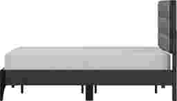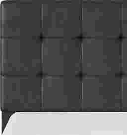 Biscuit tufting is a modern upholstery detail where the headboard fabric is stitched into an orderly, square grid pattern. Unlike traditional diamond tufting, this "biscuit" style emphasizes clean, linear geometry. On this bed, the tufting provides a tailored look that perfectly complements its contemporary design and adds subtle texture to the dark gray upholstery.