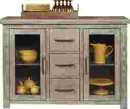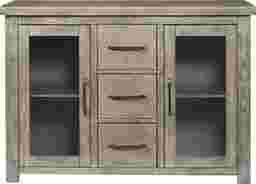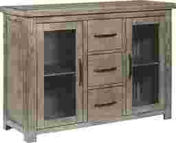 The Bristow server adds a practical, versatile element to your dining area. Spaciously designed, glass-framed doors feature an adjustable shelf behind each door, creating the perfect place to display your favorite dishes. Three middle drawers easily hide linens and silverware out of view. Crafted of pine and birch solids and veneers, a wire-brushed charcoal finish is aged and distressed to create a superior depth that really lets the natural wood grain take center stage. Oiled bronze style hardware adds a chic, industrial touch.