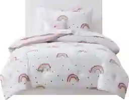 The Brivi comforter features an adorable rainbow and gold metallic star print for a cute and playful look. The comforter and shams bring a whimsical charm to your kid's bedroom and a complete sheet set with a fun unicorn print coordinates beautifully with the comforter set, while an oblong decorative pillow provides a fun finishing touch. The hypoallergenic polyester comforter and decorative pillow filling contains no allergens and is treated to be dustproof. Machine washable for easy care, this comforter and sheet set brightens up your kid's bedroom with its delightful allure. Customer assembly is required.