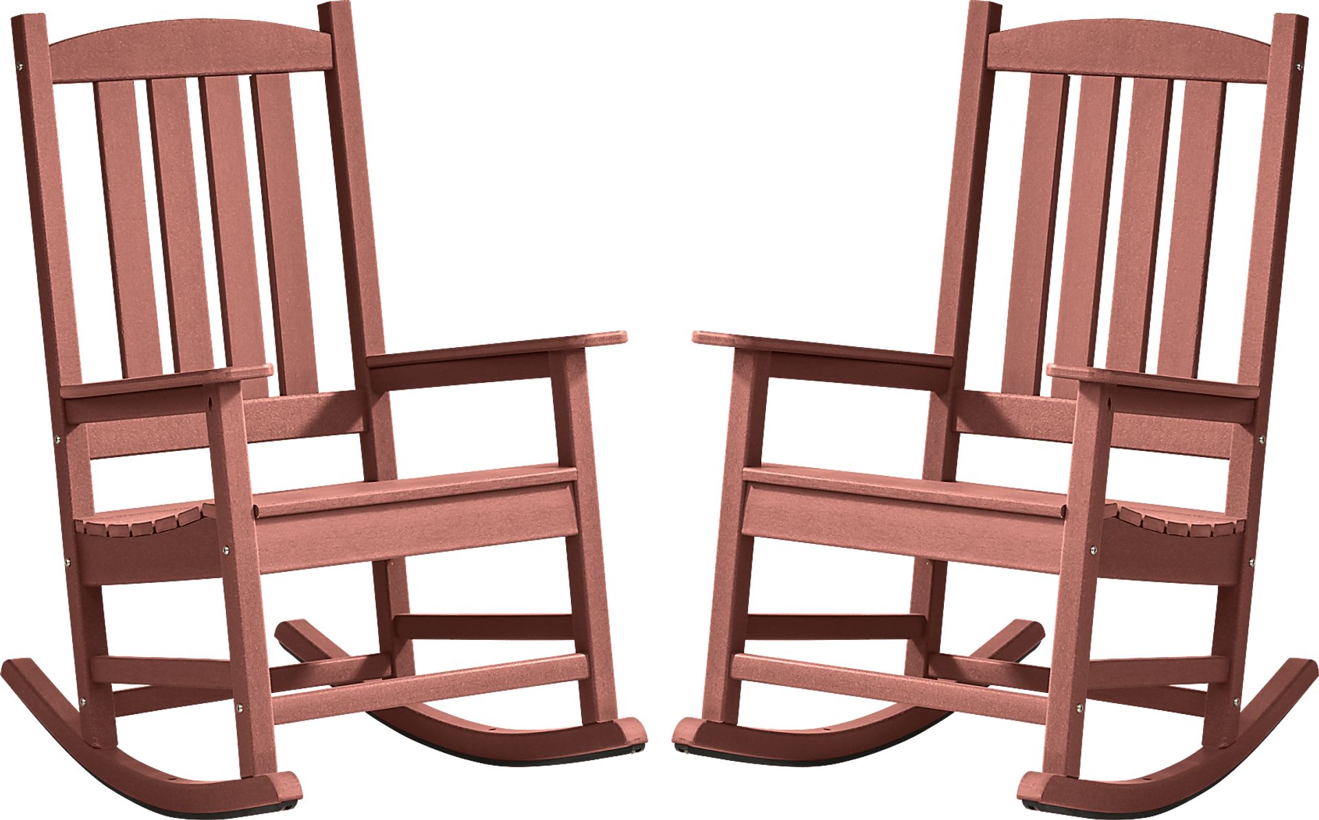 The spacious, comfortable Brocky rocking chairs bring timeless style to any outdoor space. Made using strong, durable and fade-resistant materials for low maintenance enjoyment, this set of two chairs comes in a classic red color. Perfect for relaxing in your backyard or on the porch, this piece features a high back and sturdy rocking base.