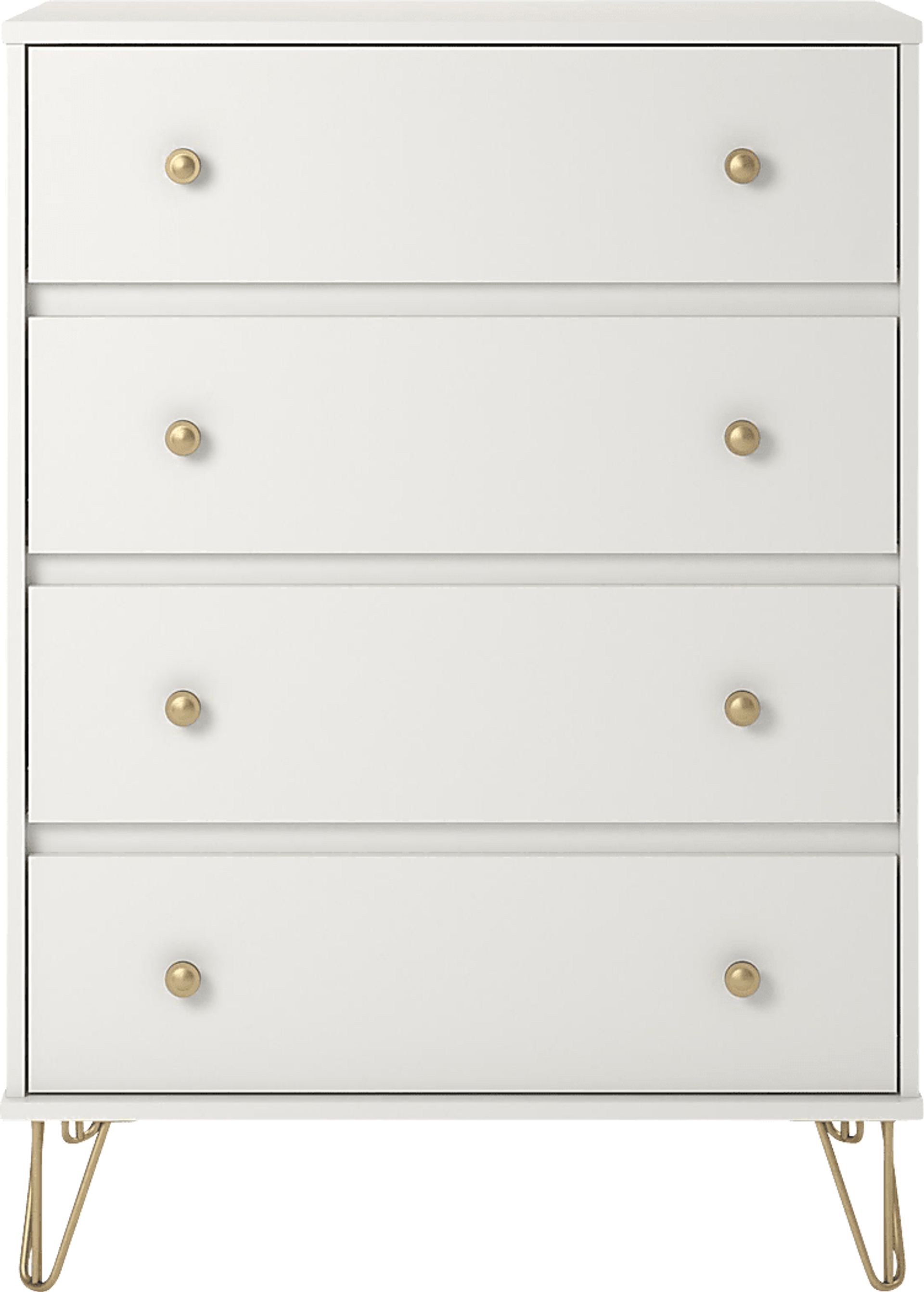 Free up closet space with the Brodgen 4 drawer dresser. The white finish on the laminated particleboard adds a modern touch while the gold metal hairpin legs bring a mid-century retro feel for a stylish piece you will love. Declutter your closet by storing away your folded t-shirts, jeans, and extra linens in the 4 spacious drawers. The durable metal slides on each drawer make opening and closing the drawers easy and smooth. Display decorations and family photos on the top surface. A wall anchor kit is included to properly secure the dresser to the wall to prevent tipping injuries and keep your family safe. Once assembled, the dresser measures to be 46.92H x 31.18W x 19.69D. Customer assembly required.