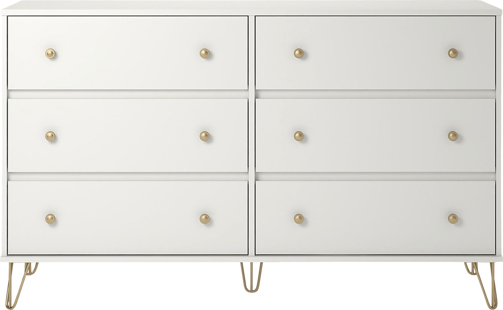 Free up closet space with the Brodgen 6 drawer dresser. The white finish on the laminated particleboard adds a modern touch while the gold metal hairpin legs bring a mid-century retro feel for a stylish piece you will love. Declutter your closet by storing away your folded t-shirts, jeans, and extra linens in the 6 spacious drawers. The durable metal slides on each drawer make opening and closing the drawers easy and smooth. Display decorations and family photos and the top surface. A wall anchor kit is included to properly secure the dresser to the wall to prevent tipping injuries and keep your family safe. Two adults are recommended to assemble. Once assembled, the Dresser measures to be 36.81H x 61.65W x 19.69D. Customer assembly required.