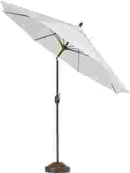 We got you covered with our Brolly umbrella. This 9' octagon shaped, push button tilt market style umbrella features durable outdoor fabric in a neutral vanilla color. The umbrella mast is constructed of a rust proof powder coated aluminum for strength and durability. The umbrella has a crank lift making opening and closing of the umbrella very easy to operate and enjoy. The umbrella and 50 lb. base can only be used with a dining table with a hole in the center, it is not a free standing item.