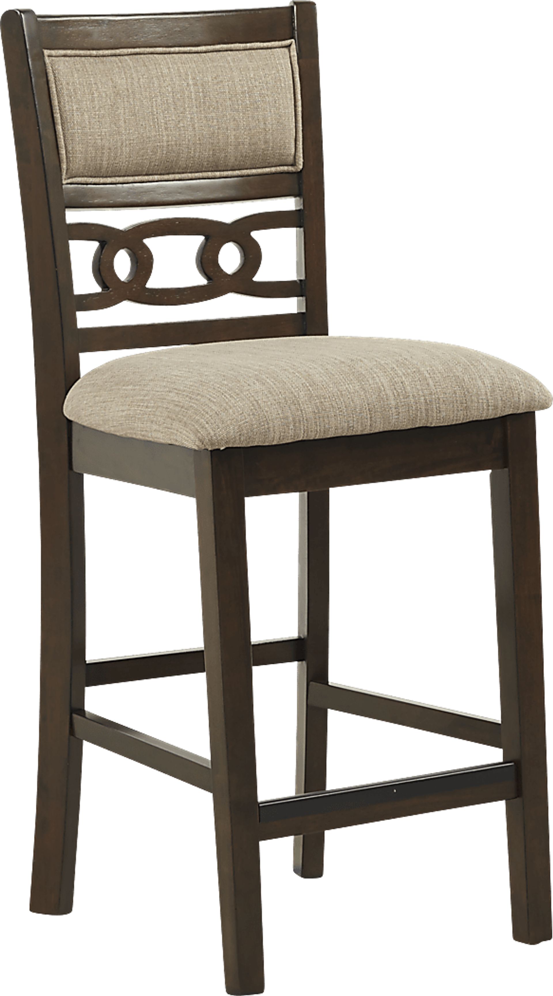 The Brookgate counter height stool's transitional style allows it to blend in with both contemporary and traditional dcor with exceptional versatility. Crafted with mindi veneers in a brown cherry finish, padding in a neutral color provides comfort and support. Accenting the back, an interlocking oval design creates attractive eye appeal.