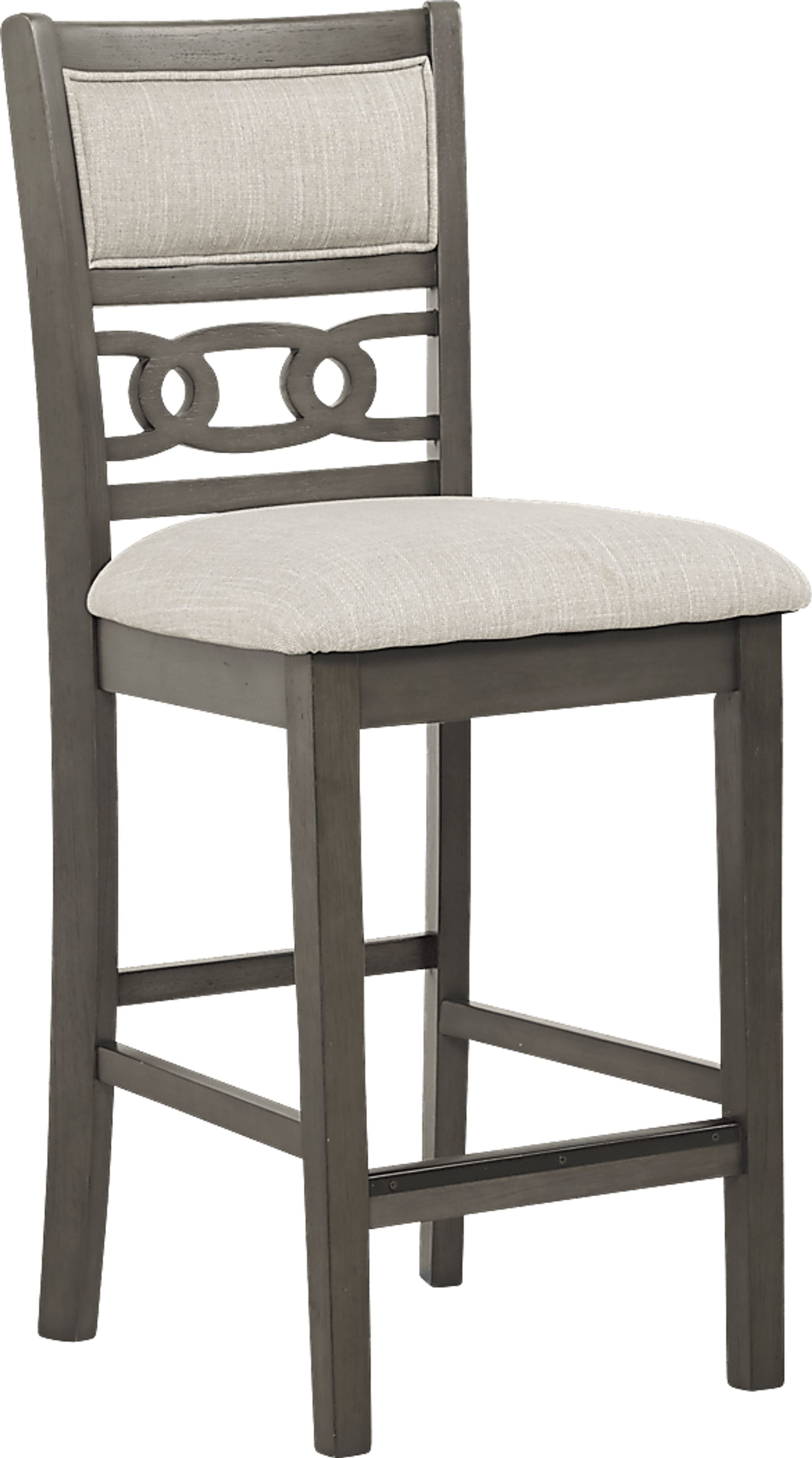 The Brookgate counter height stool's transitional style allows it to blend in with both contemporary and traditional dcor with exceptional versatility. Crafted with mindi veneers in a gray finish, padding in a neutral color provides comfort and support. Accenting the back, an interlocking oval design creates attractive eye appeal.