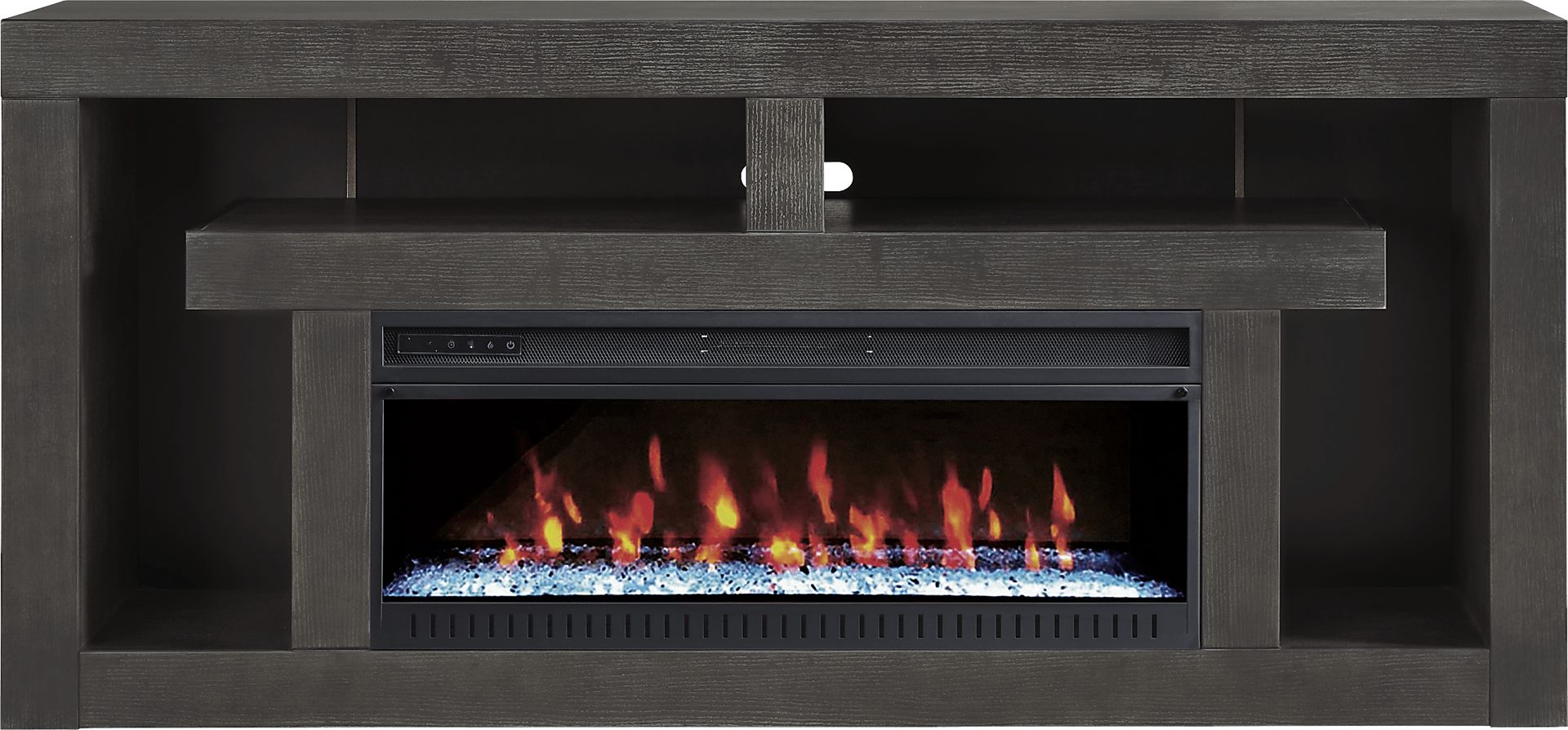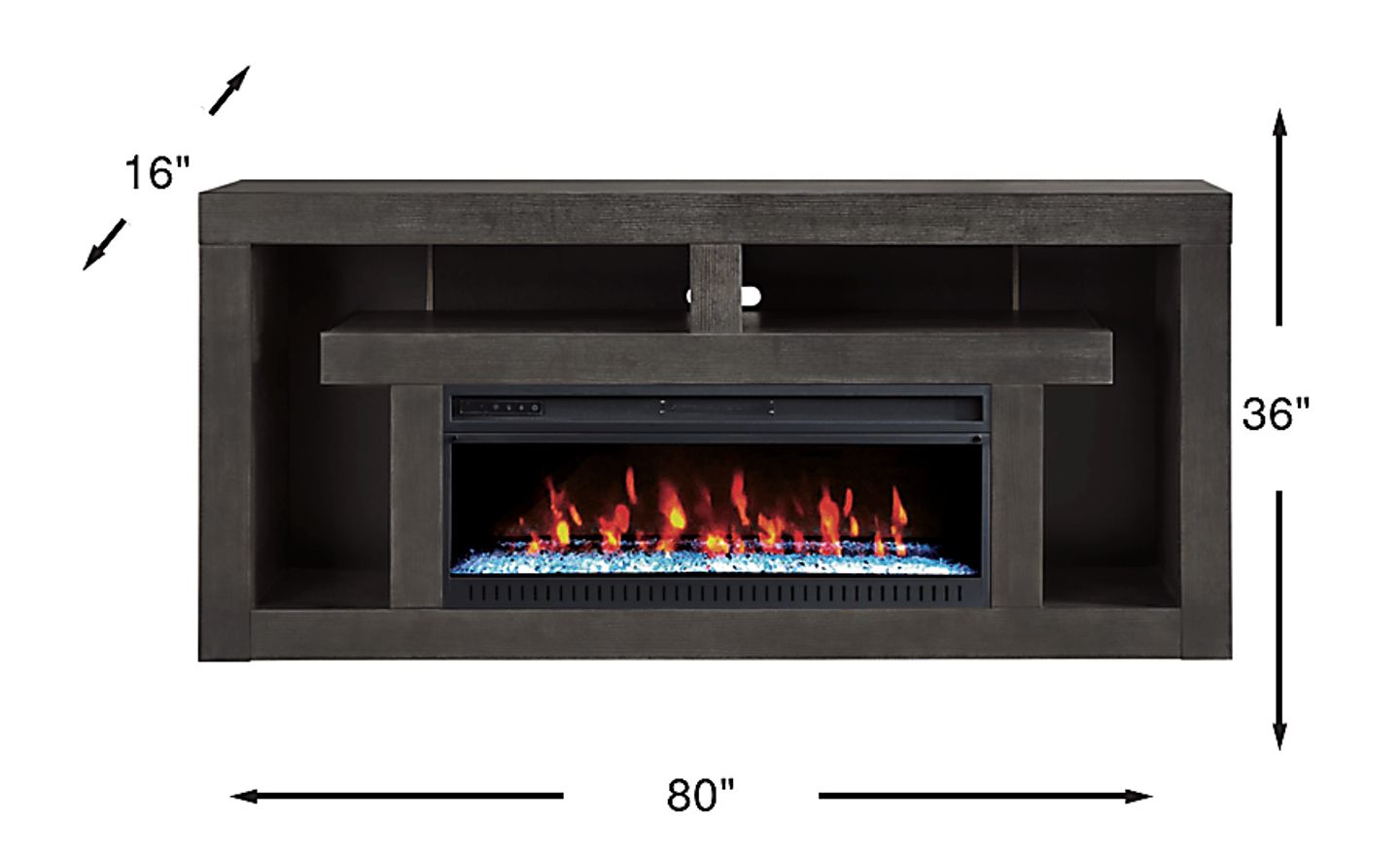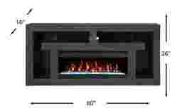 Keep storage simple and sleek with the Brookland Park console. This contemporary piece, made with wood solids, provides smooth surface space for a TV on top and an open storage and display area below. The back panel has pass through holes for wire management, while the black finish makes the console decorator friendly. This piece comes with an electric "crystal" fireplace that features ambient lighting with four color changing options across a gorgeous display of LED lights. A convenient remote controls glow levels and includes a built-in timer and adjustable thermostat.