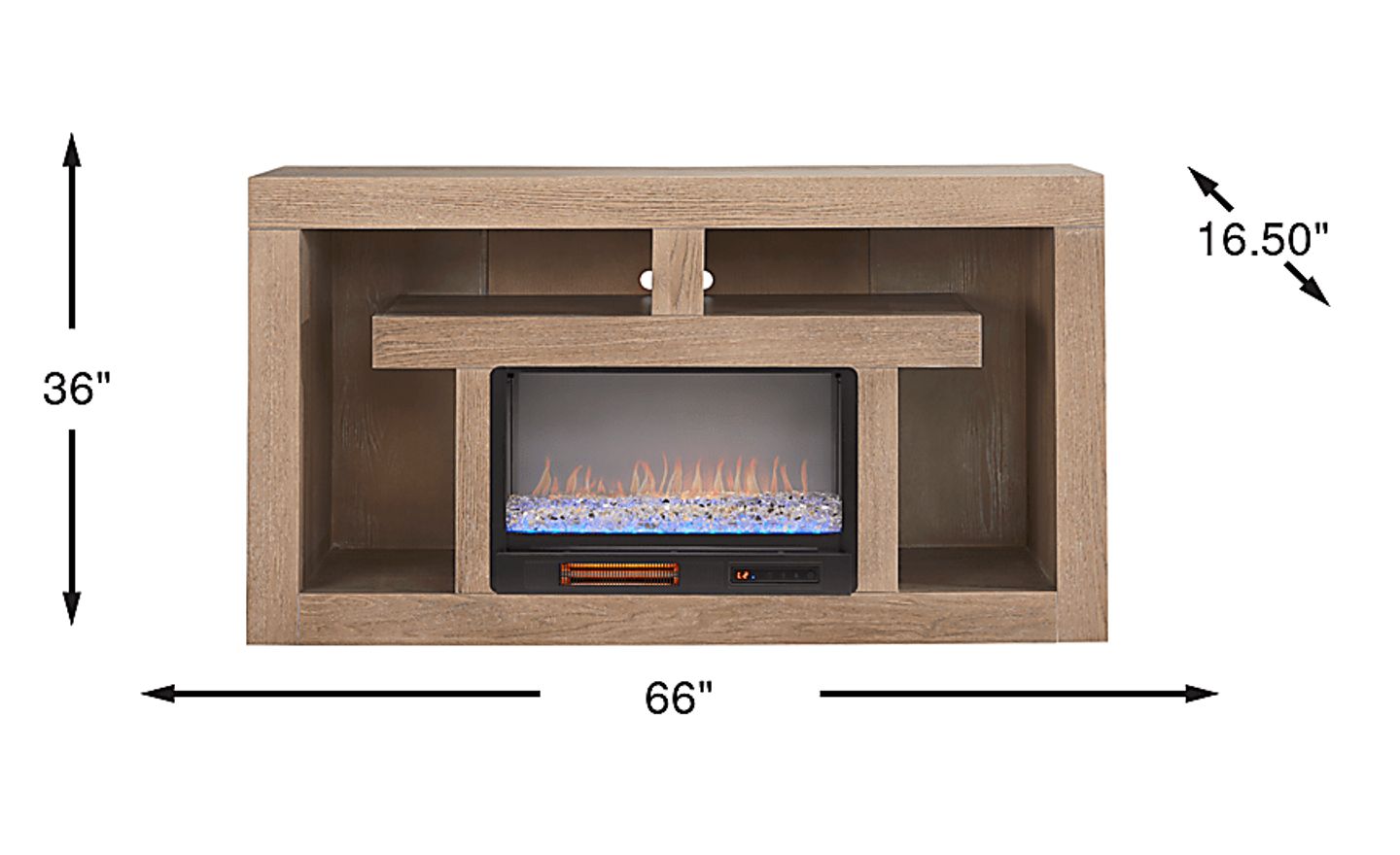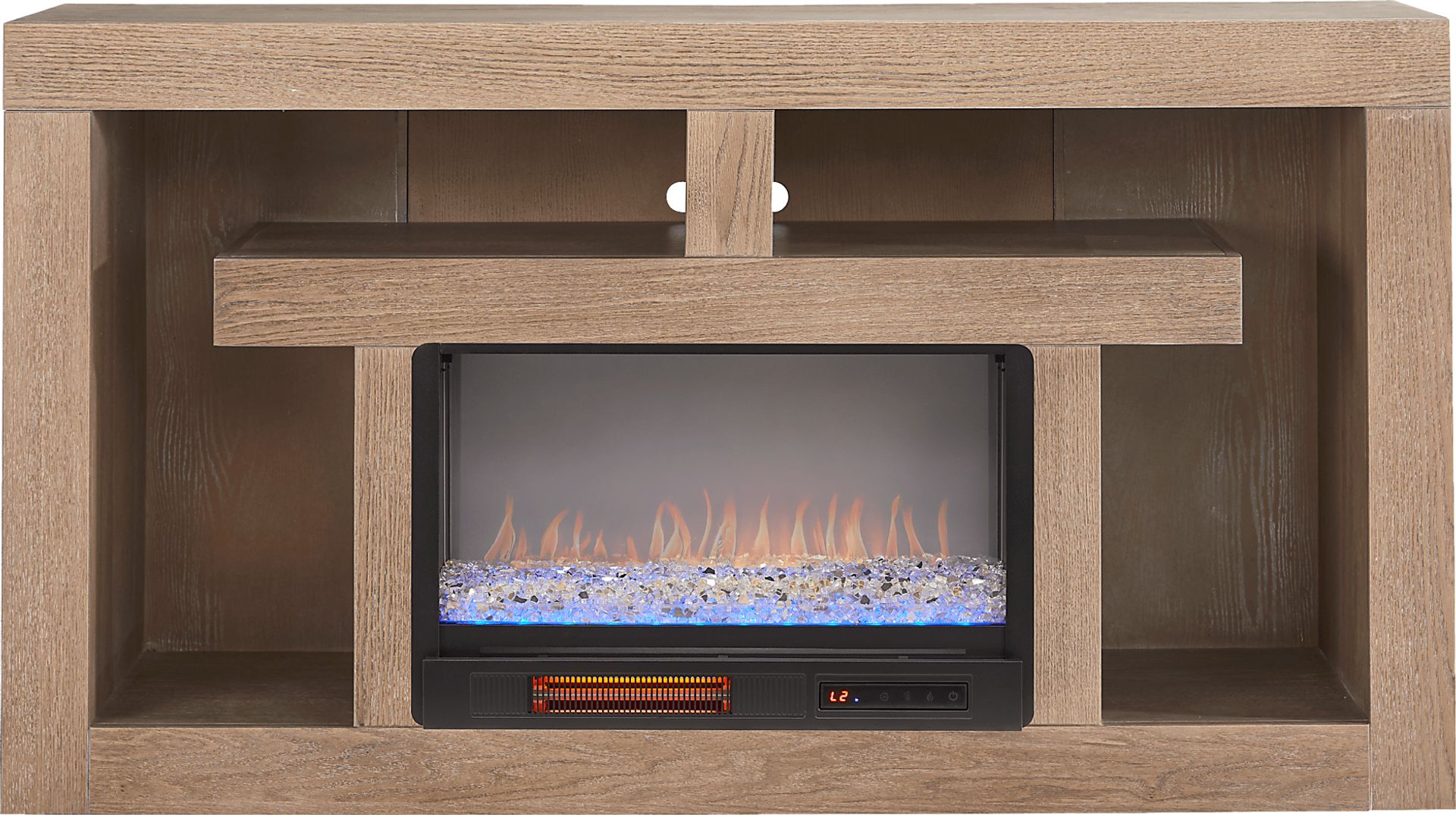 Nights of warmth and connection glow with the beautifully balanced symmetry and simple yet thoughtful details of the Brookland Park collection, creating a serene foundation for your home entertainment center. Grounded in natural charisma and transitional style, this console is finished in a soft light brown. Its clean rectangular frame offers a handsome silhouette, while the geometric open shelving with rear wire management holes provides plenty of space to organize media devices and display decorations. The included energy-saving LED firebox with remote-controlled heat and ambient lighting features four color-changing options, creating a warm and cozy atmosphere at the touch of a button.