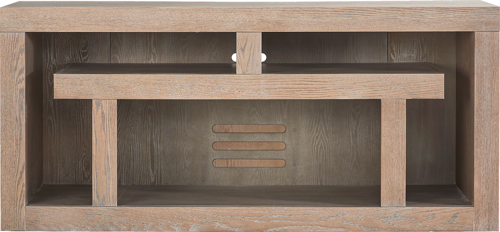 Nights of warmth and connection glow with the beautifully balanced symmetry and simple yet thoughtful details of the Brookland Park collection, creating a serene foundation for your home entertainment center. Grounded in natural charisma and transitional style, this console is finished in a soft light brown. Its clean rectangular frame offers a handsome silhouette, while the geometric open shelving with rear wire management holes provides plenty of space to organize media devices and display decorations.