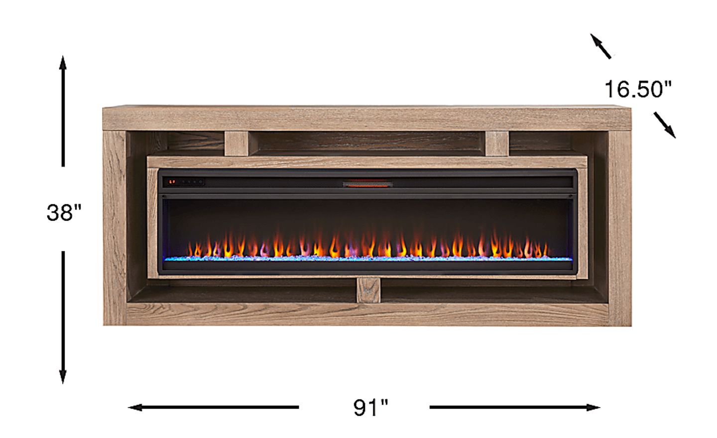Nights of warmth and connection glow with the beautifully balanced symmetry and simple yet thoughtful details of the Brookland Park collection, creating a serene foundation for your home entertainment center. Grounded in natural charisma and transitional style, this console is finished in a soft light brown. Its clean rectangular frame offers a handsome silhouette, while the geometric open shelving with rear wire management holes provides plenty of space to organize media devices and display decorations. The included energy-saving LED firebox with remote-controlled heat and ambient lighting features four color-changing options, creating a warm and cozy atmosphere at the touch of a button.
