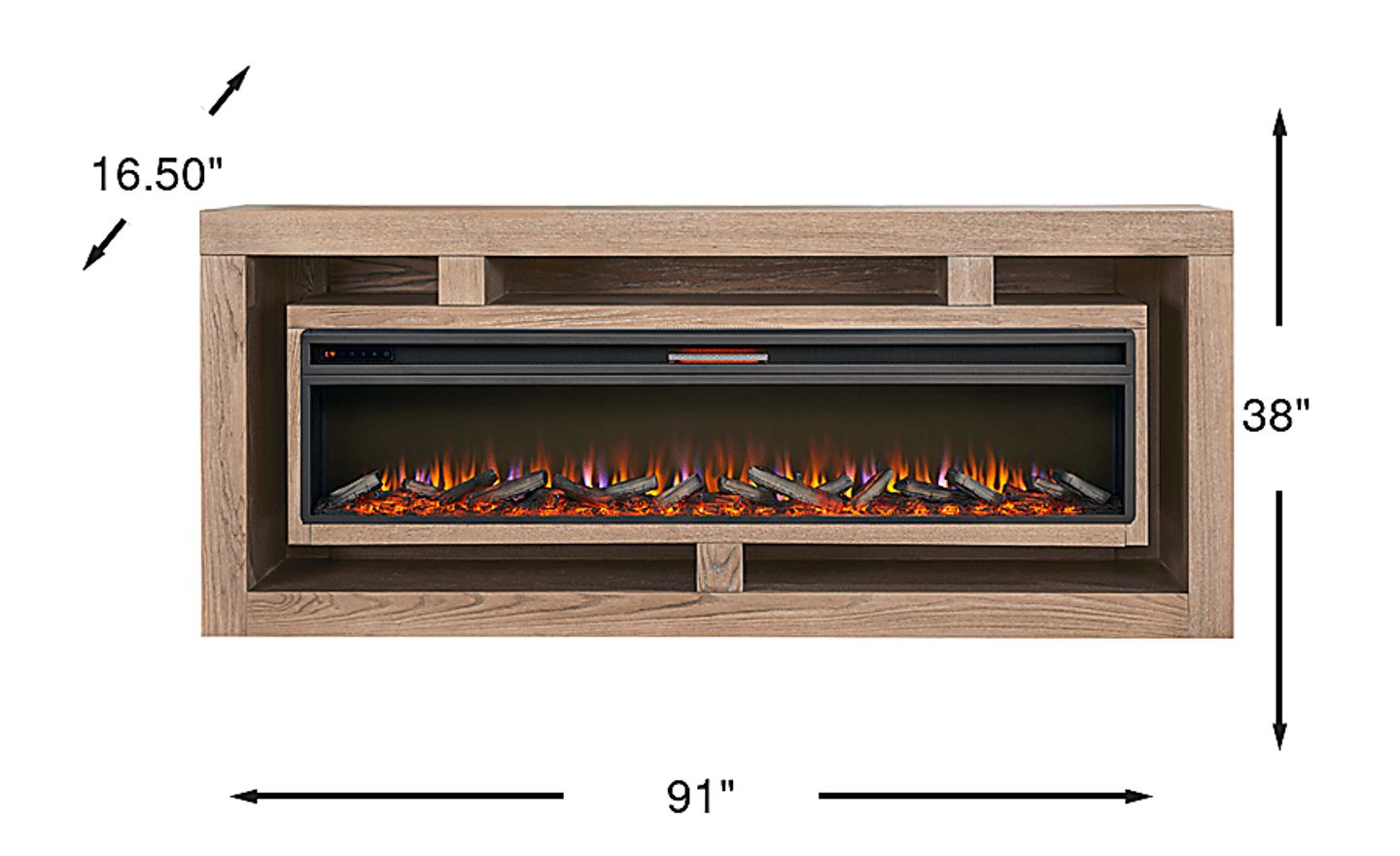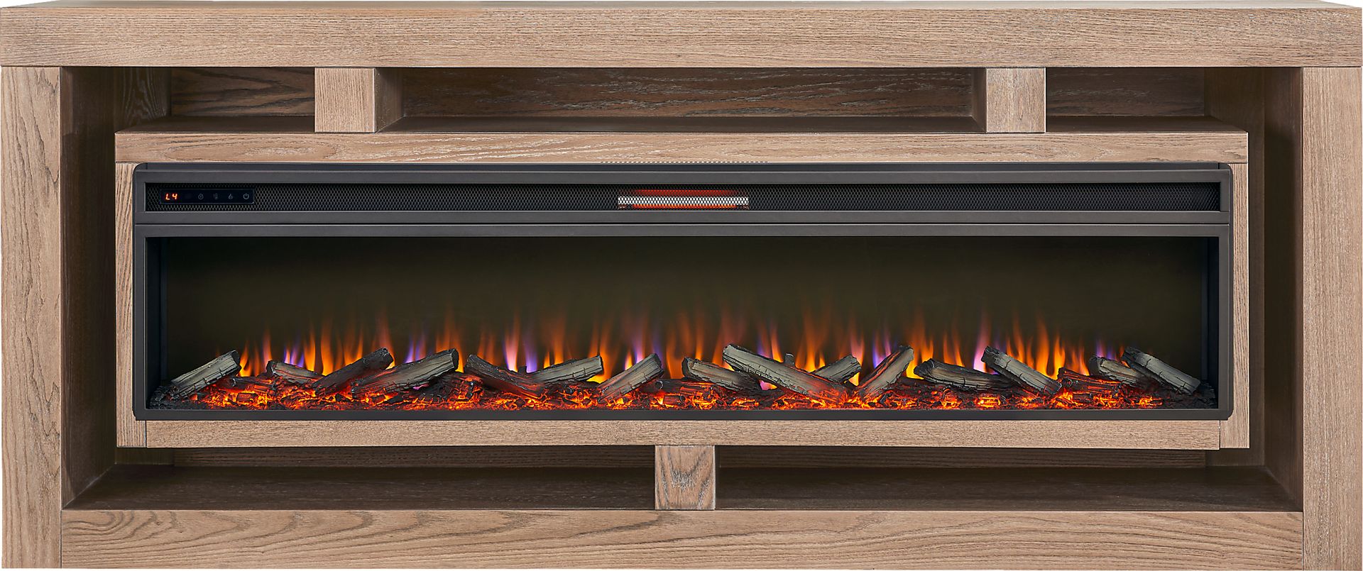 Nights of warmth and connection glow with the beautifully balanced symmetry and simple yet thoughtful details of the Brookland Park collection, creating a serene foundation for your home entertainment center. Grounded in natural charisma and transitional style, this console is finished in a soft light brown. Its clean rectangular frame offers a handsome silhouette, while the geometric open shelving with rear wire management holes provides plenty of space to organize media devices and display decorations. The included removable log fireplace features flickering flames and faux embers, working with or without heat for a warm ambiance year-round.