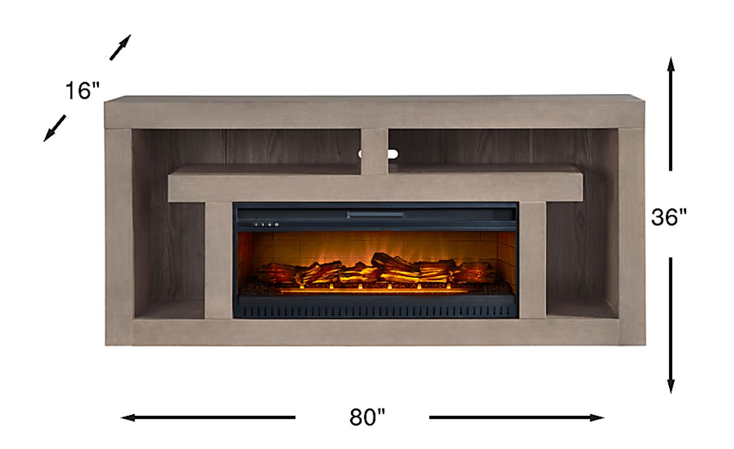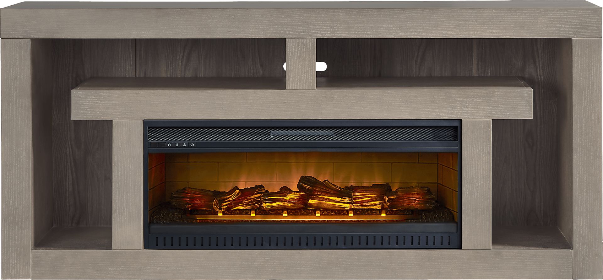 Keep storage simple and sleek with the Brookland Park console. This contemporary piece, made with wood solids, provides smooth surface space for a TV on top and an open storage and display area below. The back panel has pass through holes for wire management, while the gray finish makes the console decorator friendly. This piece comes with an electric "log" fireplace that features innovative flame effects on bricks and logs for added depth and 3D realism. A convenient remote controls glow levels and includes a built-in timer and adjustable thermostat.