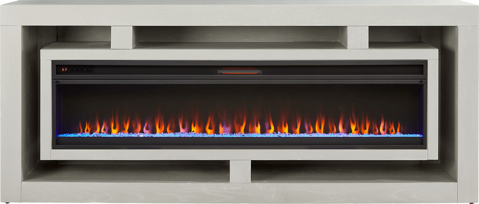 Nights of warmth and connection glow with the beautifully balanced symmetry and simple yet thoughtful details of the Brookland Park collection, creating a serene foundation for your home entertainment center. Grounded in natural charisma and transitional style, this console is finished in a soft light gray. Its clean rectangular frame offers a handsome silhouette, while the geometric open shelving with rear wire management holes provides plenty of space to organize media devices and display decorations. The included energy-saving LED firebox with remote-controlled heat and ambient lighting features four color-changing options, creating a warm and cozy atmosphere at the touch of a button.
