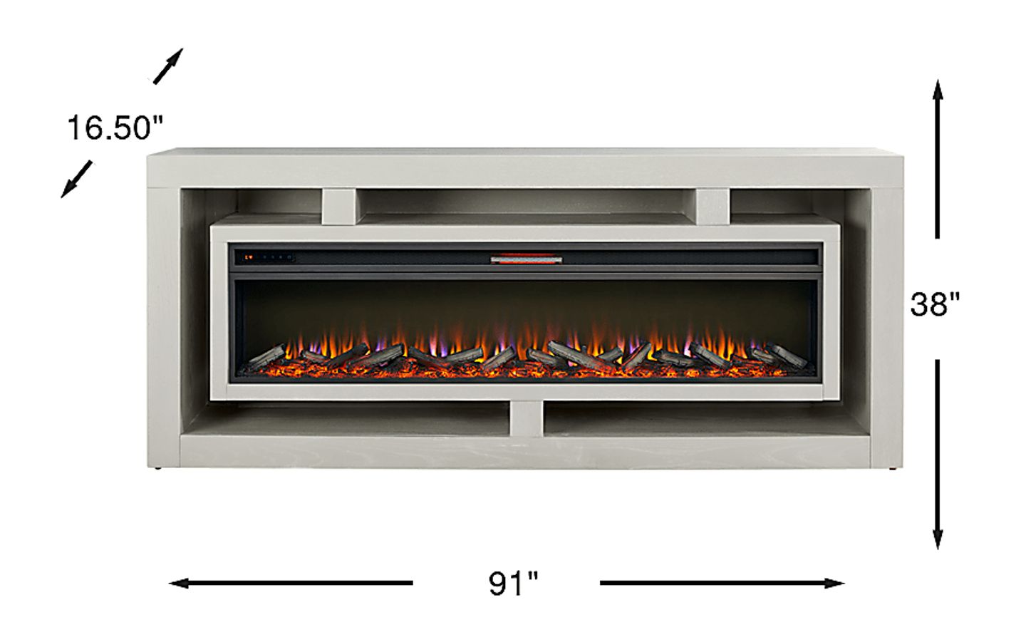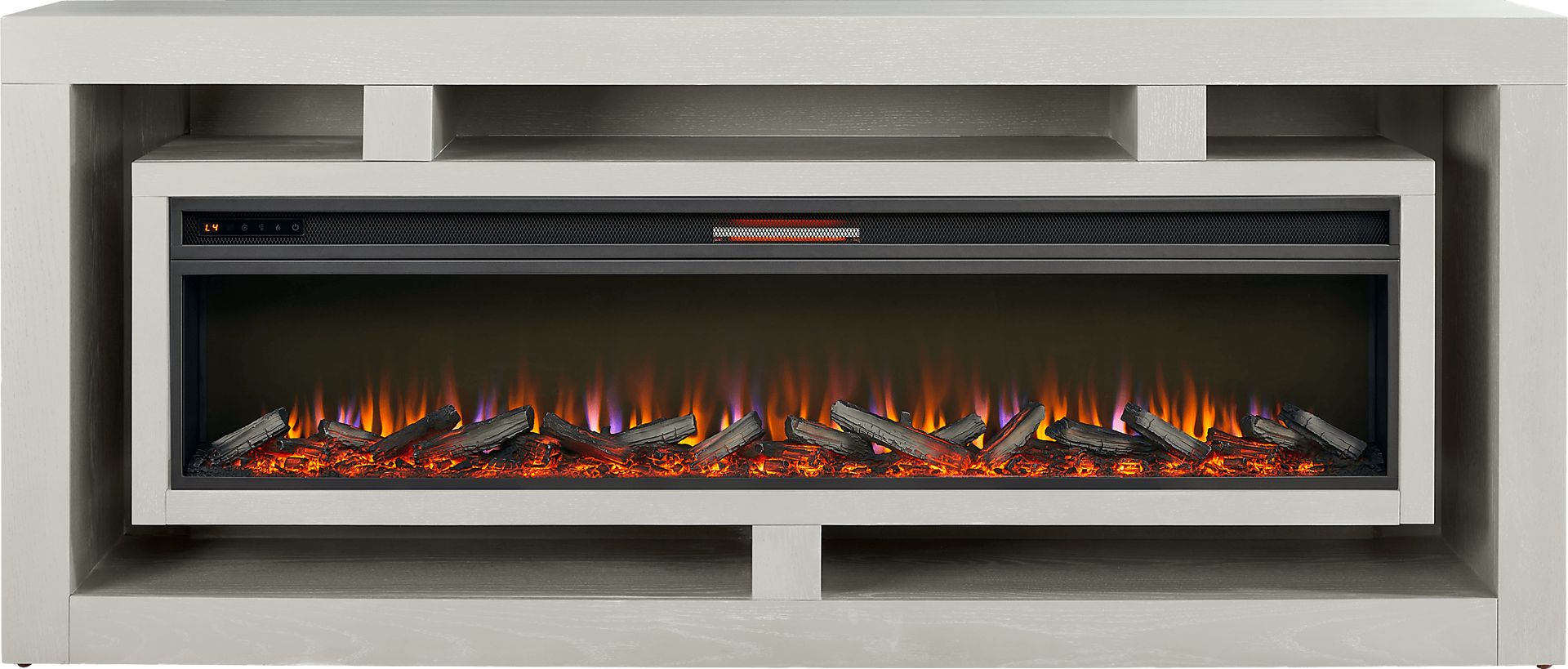 Nights of warmth and connection glow with the beautifully balanced symmetry and simple yet thoughtful details of the Brookland Park collection, creating a serene foundation for your home entertainment center. Grounded in natural charisma and transitional style, this console is finished in a soft light gray. Its clean rectangular frame offers a handsome silhouette, while the geometric open shelving with rear wire management holes provides plenty of space to organize media devices and display decorations. The included removable log fireplace features flickering flames and faux embers, working with or without heat for a warm ambiance year-round.