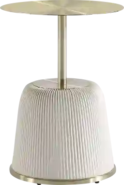 Introducing the striking Broomcage I cream end table, a versatile addition to your living and dining spaces. Crafted with artistic flair, it features unique leatherette pleating and beautiful gold metal finishes that adds a touch of stunning design to your home decor. Built with a high-quality steel frame and feet, this table effortlessly combines style and durability.
