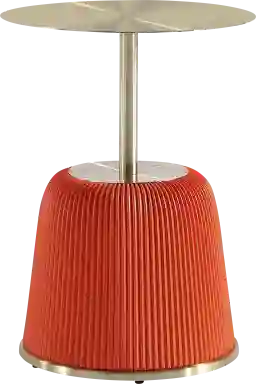 Introducing the striking Broomcage I orange end table, a versatile addition to your living and dining spaces. Crafted with artistic flair, it features unique leatherette pleating and beautiful gold metal finishes that adds a touch of stunning design to your home decor. Built with a high-quality steel frame and feet, this table effortlessly combines style and durability.