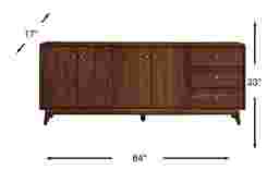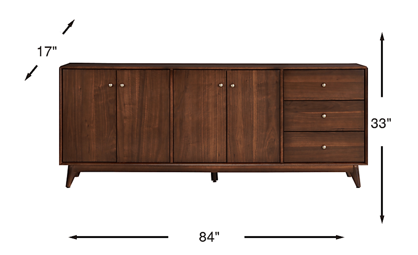 As perfect for channel surfing as it is for channeling a new style profile, the Broxbern credenza enriches your home entertainment space with plenty of panache to spare. Crafted of poplar solids and veneers in walnut finish, this piece is equipped with plenty of space for a television, decor and more. You can even stash away home media players inside the dual cabinets' hidden shelves. Rear wire management holes keep cords organized for seamless accessibility. Three side drawers offer even more hidden storage. Pewter hardware and Midcentury-inspired canted legs offer the contemporary console a phenomenal final style details.