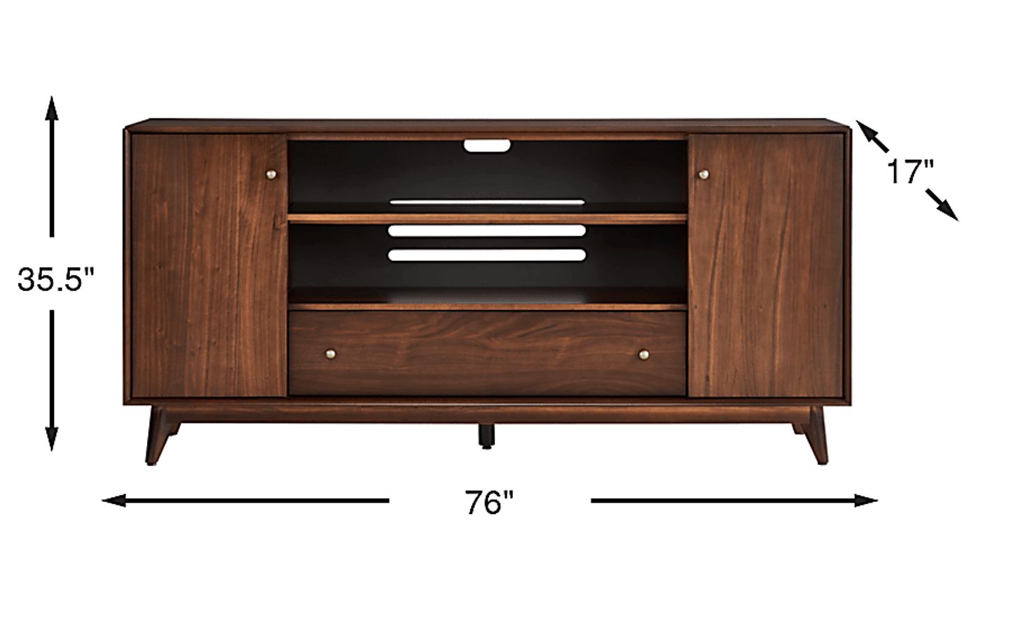 With a generous width of 76 inches, this console is expertly scaled to support large-format televisions. For the most balanced aesthetic, we recommend pairing it with TVs up to 75 inches (measured diagonally). This ensures the console remains wider than the screen, providing a stable visual anchor and leaving room on either side for speakers or decor. While it can accommodate many 85-inch models, a 65- to 75-inch TV typically offers the most proportional look for this mid-century design.