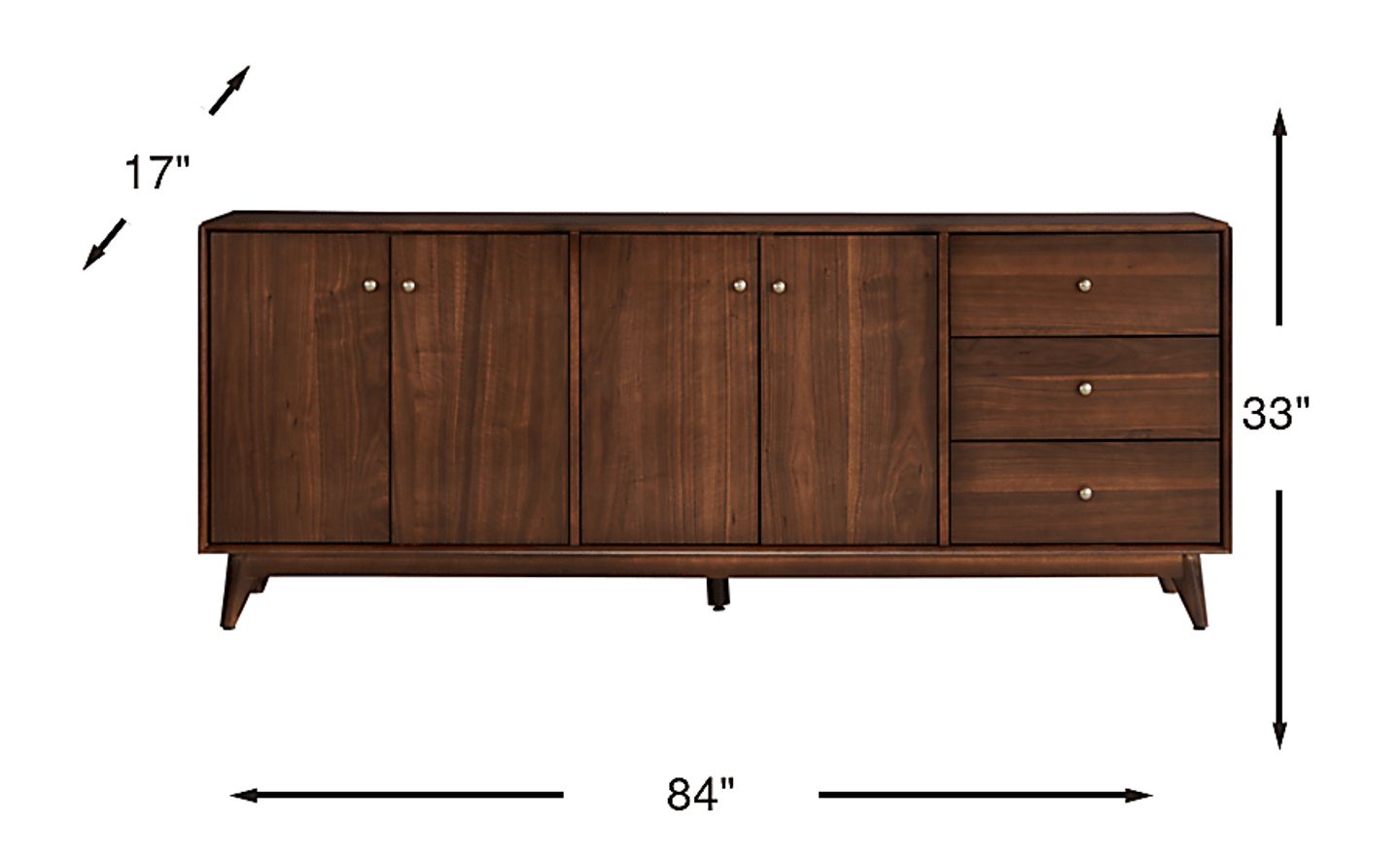 As perfect for channel surfing as it is for channeling a new style profile, the Broxbern credenza enriches your home entertainment space with plenty of panache to spare. Crafted with pine veneers in walnut finish, this piece is equipped with plenty of space for a television, decor and more. You can even stash away home media players inside the dual cabinets' hidden shelves. Rear wire management holes keep cords organized for seamless accessibility. Three side drawers offer even more hidden storage. Pewter hardware and Midcentury-inspired canted legs offer the contemporary console a phenomenal final style details.