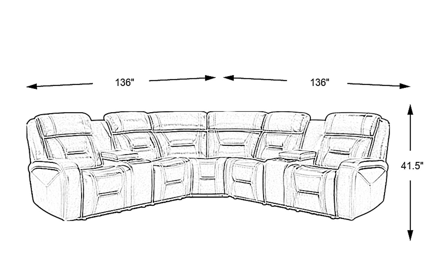 Whether you're getting ready for a big game or a big family movie night, the Brunswick dual power reclining sectional takes complete relaxation to new heights. Sleekly styled with bold contemporary flair, this sectional is upholstered with dark gray top grain leather where the body touches. Distinctive stitching details and pronounced tufting highlight the piece's tailored appearance to fantastic effect. With three dual power recliners that feature power adjustable headrests and footrests, this sectional's zero gravity mechanism places your feet above your heart to create an optimal amount of pressure on the lower back when fully reclined. Fold down storage consoles include lighted cupholders with recline controls and USB charging ports for seamless accessibility. Ambient base rail lighting on the bottom helps to create a cineplex-like experience with a two-hour timer. Upholstery: Top grain leather where the body touches and polyurethane fabric sides and backs.