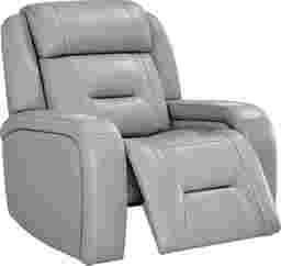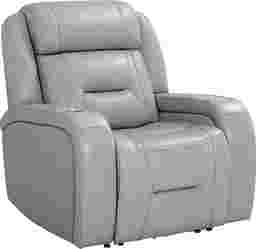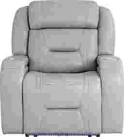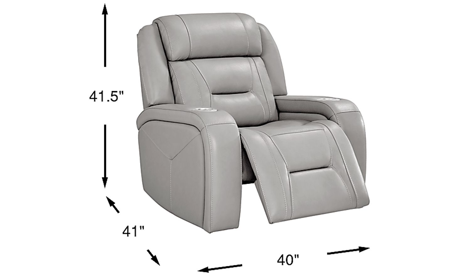 Whether you're getting ready for a big game or a big family movie night, the Brunswick dual power recliner takes complete relaxation to the next level. Sleekly styled with bold contemporary flair, the recliner is upholstered with light gray top grain leather where the body touches. Distinctive stitching details and pronounced tufting highlight the piece's tailored appearance to fantastic effect. With power adjustable headrests and footrests, the recliner's zero gravity mechanism places your feet above your heart to create an optimal amount of pressure on the lower back when fully reclined. The recline controls are located on the lighted cupholder with USB charging ports for seamless accessibility. Ambient base rail lighting on the bottom helps to create a cineplex-like experience with a two-hour timer. Upholstery: Top grain leather where the body touches and polyurethane fabric sides and backs.