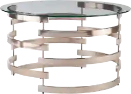 Slip this circular Bryden cocktail table into your living room for a divine dose of contemporary excellence. Shiny champagne base has an open, interlocking design full of airy negative space. Tempered glass top blends with decor, plus open frame makes it great for smaller living areas. The round shape and abstract style of this cocktail table evoke Art Deco appeal. Customer assembly required.