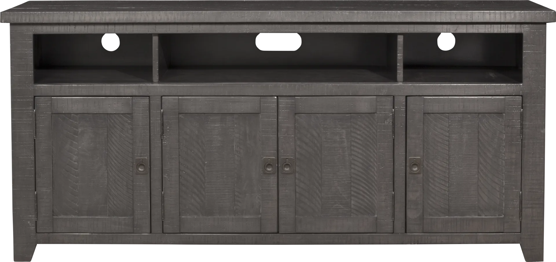 The Bryn Avenue console features a reclaimed lumber look with rough-hewn saw and distress marks, fitting perfectly with a rustic, farmhouse or coastal decor. Featuring the Lightning Fast Assembly System: Easy, quick, and tool less assembly process allows for the TV stand to be assembled in 10 minutes or less. Constructed from solid New Zealand Radiata pine body and a pine veneer back panel. Three (3) large, open component cubbies allow for plenty of space to store TV, video, audio and video game components. A total of four (4) doors give access to three cabinets, one large middle cabinet and two smaller cabinets on each side. Each cabinet features one adjustable and removable shelf along with vertical wire management cutouts. The recessed campaign-style door pulls offer a nice complement to the rustic finish details. Ideal for most 65" flat panel TVs and up to 70". Customer assembly required.