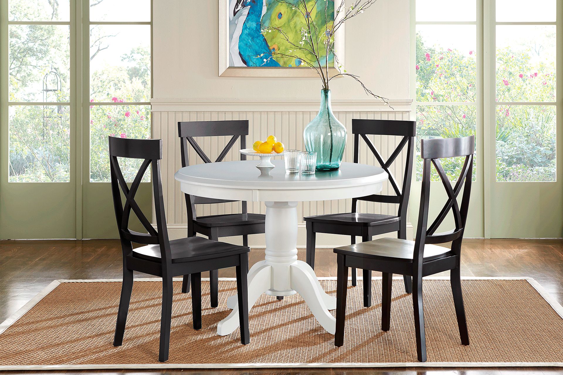 The charming country cottage style of the Brynwood dining set makes it a welcoming choice for any dining area. Crafted of wood solids, the table features a fresh white finish and an attractive X-backed set of black chairs with a rustic touch. A pedestal table base gives this set a chic, timeless appeal that will look great for years to come.