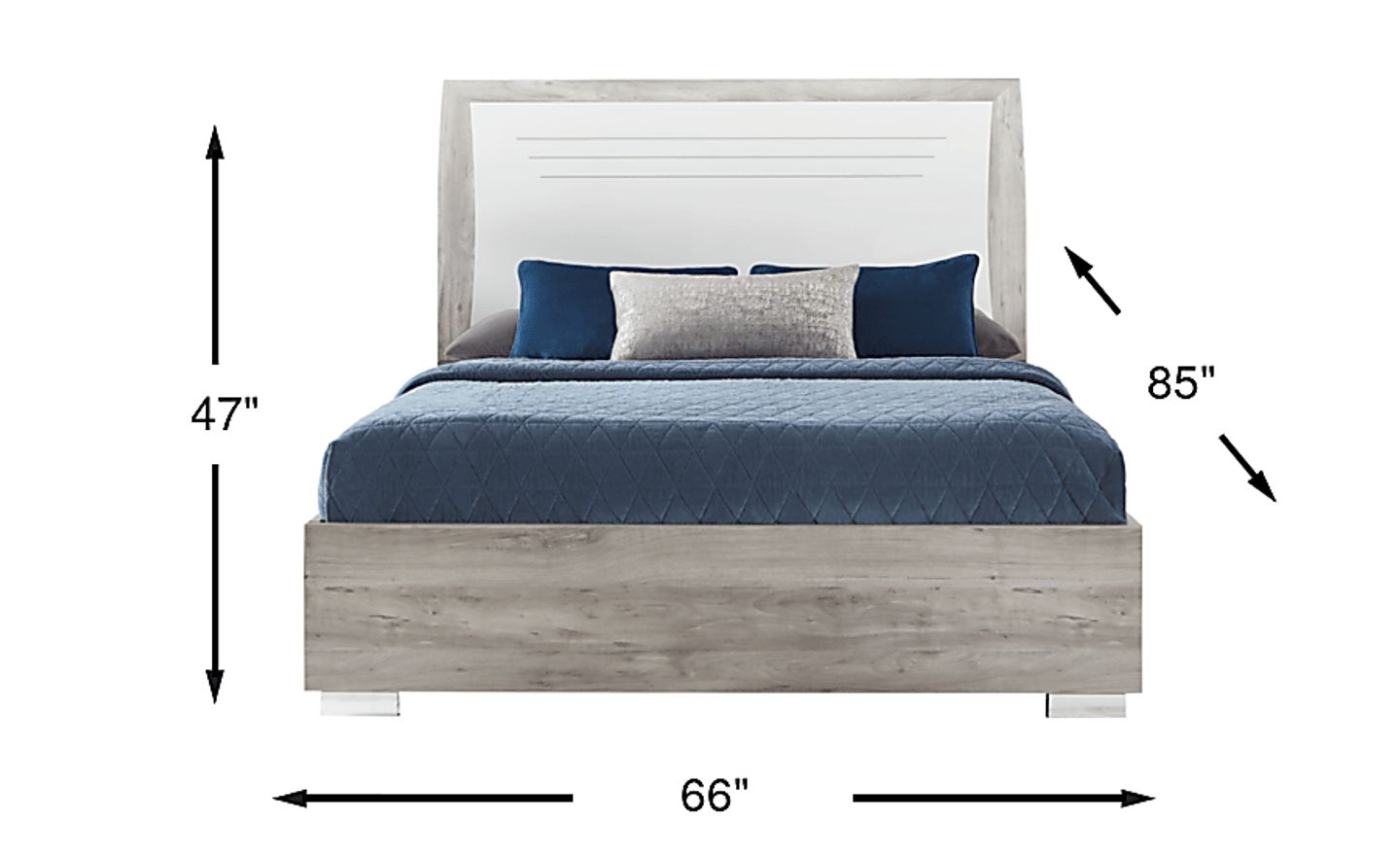Bring upscale style to your bedroom with the Buccone Heights bed. Featuring sleek lines and a wood grain-inspired pattern, this bed combines contemporary and rustic appeal. For decorative dimension, its high gloss two-tone white and gray finish is complemented by a curved headboard. Mattress and foundation (if required) sold separately.