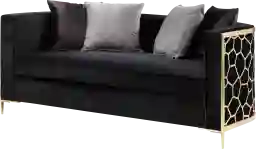 With an impressive metal gold base and eye-catching geometric patterned sides merged with a traditional tuxedo design, the Buellton black loveseat with four pillows is sure to impress everyone. The luxurious black velvet upholstery makes the gold accents pop, initiating them as the focal point of your living space. The wooden inner frame makes for durable construction, while the seats provide hours of comfort.