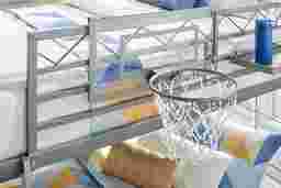 This basketball hoop accessory is specifically designed for the Build-a-Bunk collection. It features a custom mounting system that allows it to attach directly to the bunk frame, ensuring a secure and stable fit that "universal" or over-the-door hoops often lack.