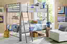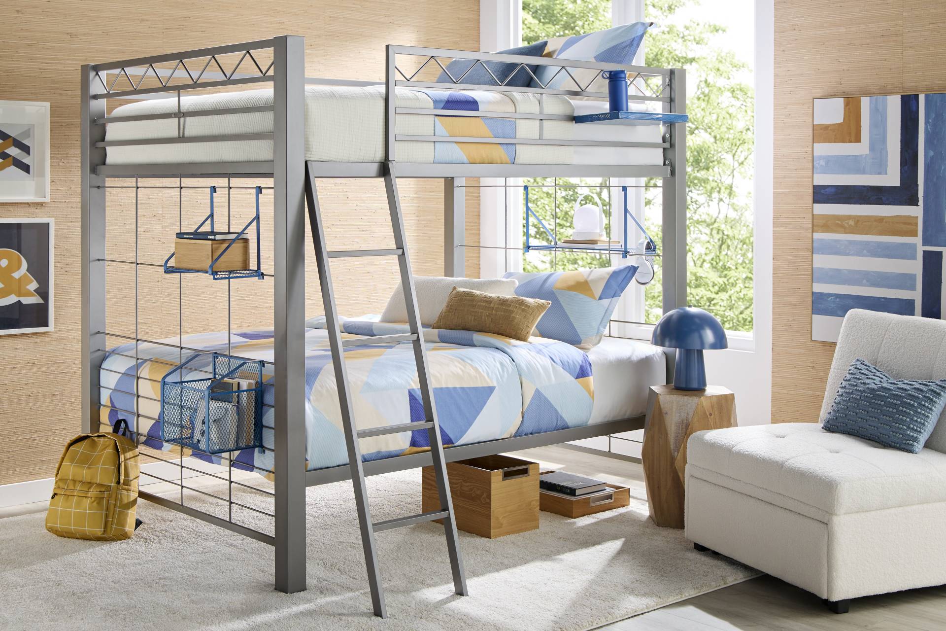 Give your children an ultra-cool sleeping space that they can customize at will! Constructed of metal with a gray finish, the Build-a-Bunk full/full bunk bed adds an instant dash of industrial style with its clean, minimalist look. And this bunk is so much more than the typical bunk bed. It has a highly customizable, space-saving design that includes a basket, short bookshelf, long bookshelf, and a tray in a bold blue finish. Each of these pieces is removable and can be adjusted on the left or right side of the bunk, depending on preference or room layout. You can use the bookshelves for books, trophies, or other trinkets. The basket is a great place to store games or homework close by, and the tray can easily accommodate workbooks or snacks. Mattresses and foundations (if required) sold separately. Bunk shown is twin/twin.