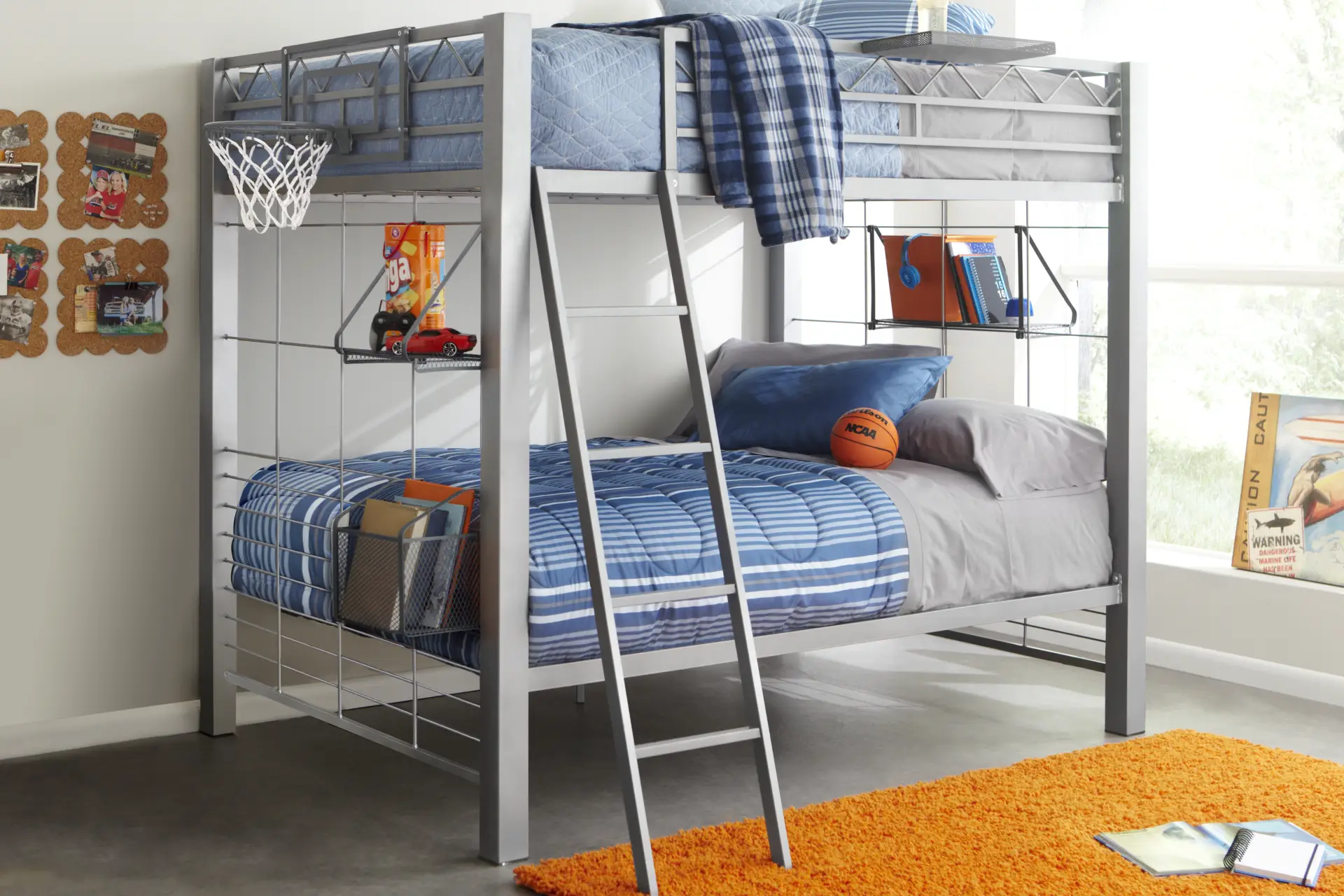 Give your children an ultra-cool sleeping space that they can customize at will! Constructed of metal with a gray finish, the Build-a-Bunk full/full bunk bed adds an instant dash of industrial style with its clean, minimalist look. And this bunk is so much more than the typical bunk bed. It has a highly customizable, space-saving design that includes a basket, short bookshelf, long bookshelf, tray and basketball hoop in a gray finish. Each of these pieces is removable and can be adjusted on the left or right side of the bunk, depending on preference or room layout. You can use the bookshelves for books, trophies, or other trinkets. The basket is a great place to store games or homework close by, and the tray can easily accommodate workbooks or snacks. The look's real MVP, though, is the basketball hoop. Mattresses and foundations (if required) sold separately.