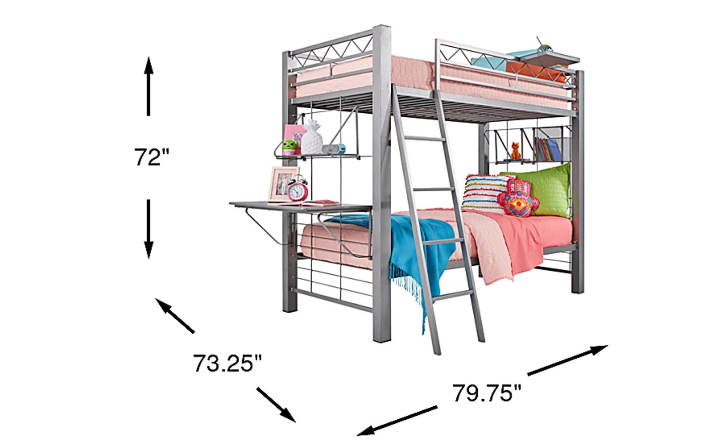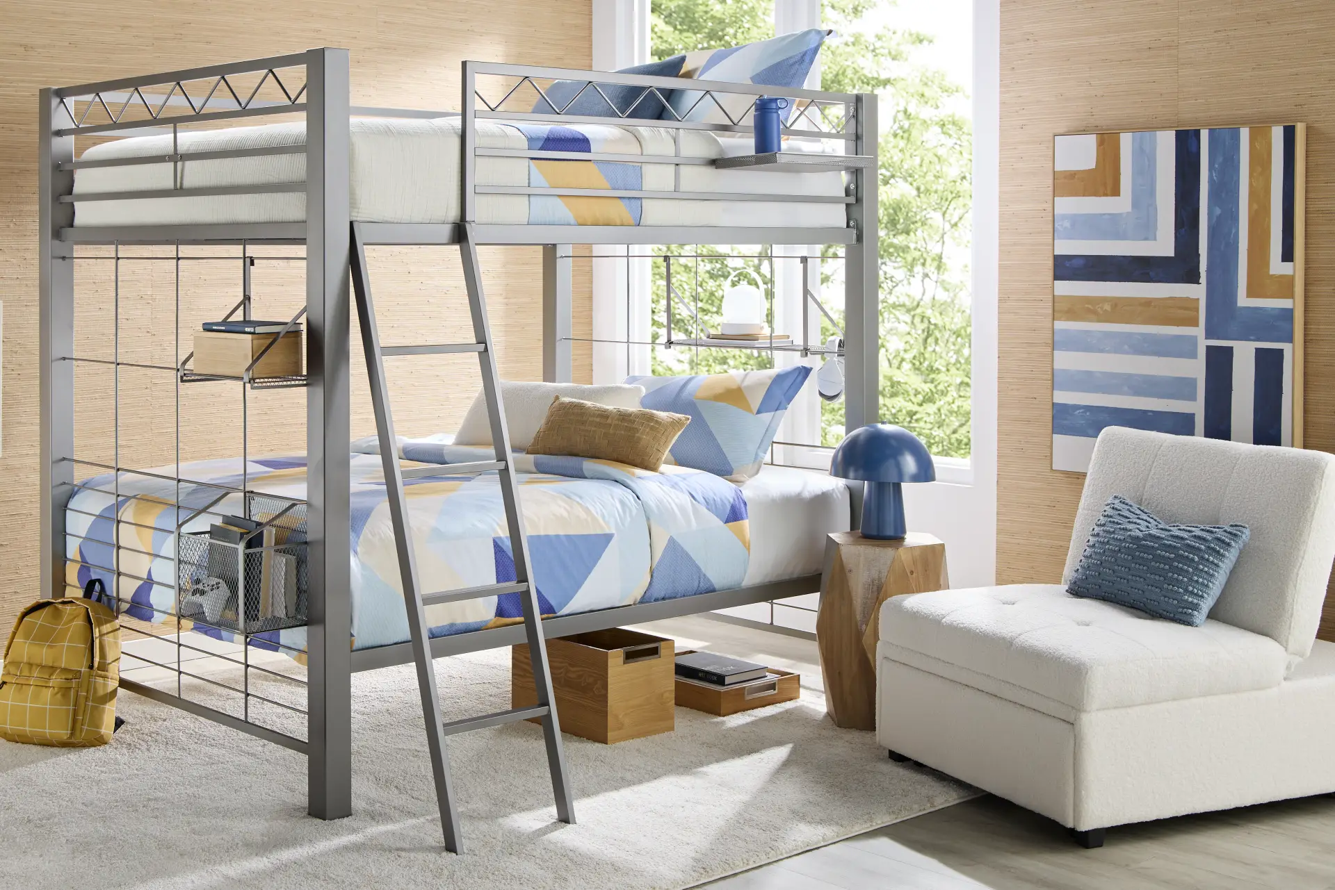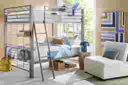 Give your children an ultra-cool sleeping space that they can customize at will! Constructed of metal with a gray finish, the Build-a-Bunk full/full bunk bed adds an instant dash of industrial style with its clean, minimalist look. And this bunk is so much more than the typical bunk bed. It has a highly customizable, space-saving design that includes a basket, short bookshelf, long bookshelf, and a tray in a gray finish. Each of these pieces is removable and can be adjusted on the left or right side of the bunk, depending on preference or room layout. You can use the bookshelves for books, trophies, or other trinkets. The basket is a great place to store games or homework close by, and the tray can easily accommodate workbooks or snacks. Mattresses and foundations (if required) sold separately. Bunk shown is twin/twin. Desk not included in bed package; sold separately.