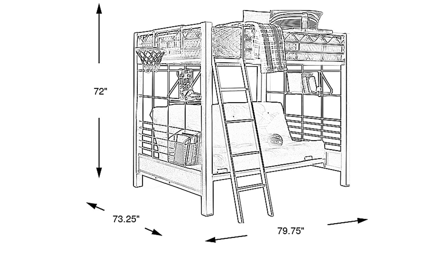 Give your child an ultra-cool sleeping space that they can customize at will! Constructed of metal with a gray finish, the Build-a-Bunk full/futon loft bed adds an instant dash of industrial style with its clean, minimalist look. It has a highly customizable, space-saving design that includes a basket, short bookshelf, long bookshelf, tray and basketball hoop in a bold blue finish. Each of these pieces is removable and can be adjusted on the left or right side of the bed, depending on preference or room layout. The futon is a great place for friends to chill, or used as a sleeping space for overnight guests (futon mattress included). You can use the bookshelves for books, trophies, or other trinkets. The basket is a great place to store games or homework close by, and the tray can easily accommodate workbooks or snacks. The look's real MVP, though, is the basketball hoop. Mattress and foundation (if required) sold separately.