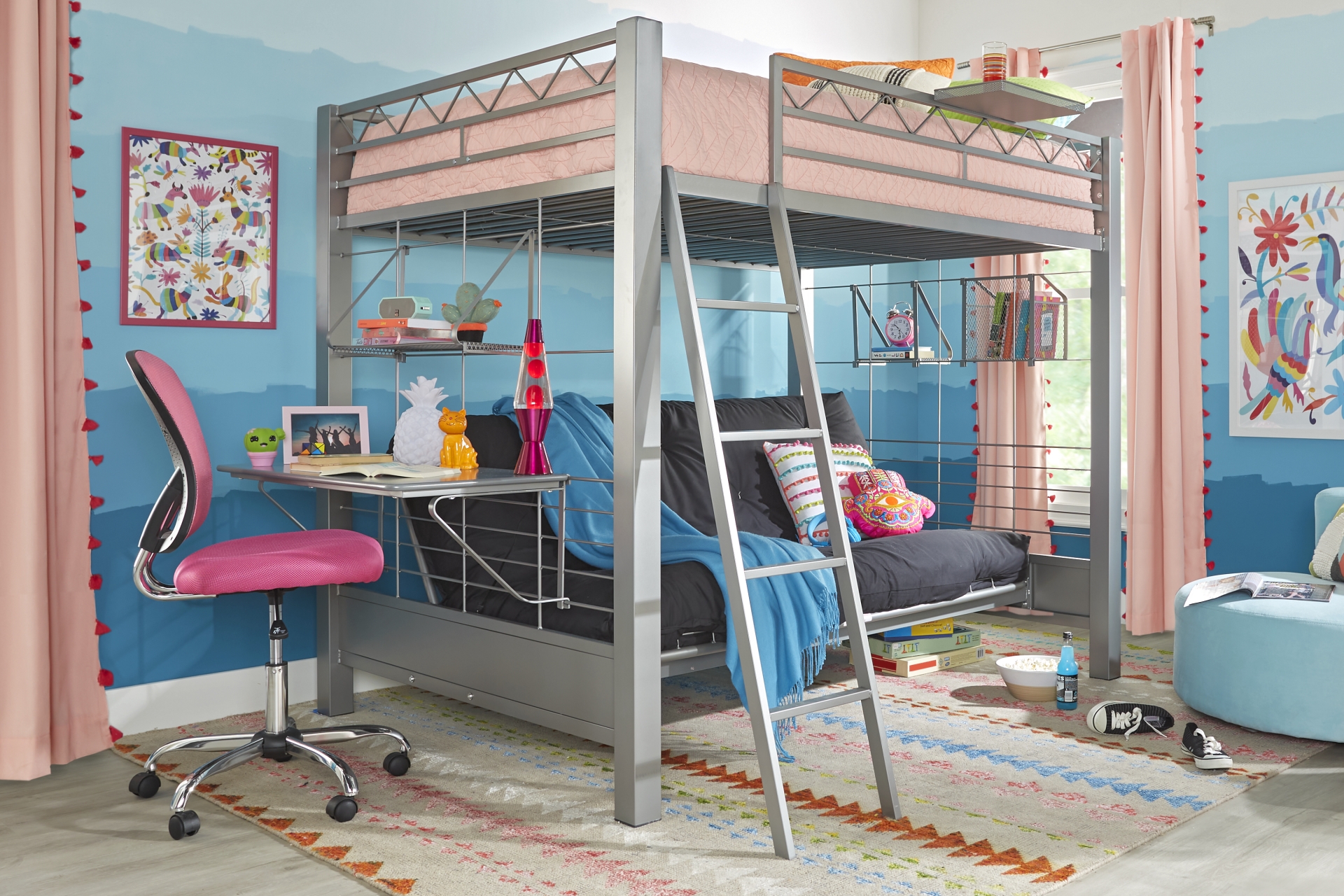 Give your child an ultra-cool sleeping space that they can customize at will! Constructed of metal with a gray finish, the Build-a-Bunk full/futon loft bed adds an instant dash of industrial style with its clean, minimalist look. It has a highly customizable, space-saving design that includes a desk, basket, short bookshelf, long bookshelf, and a tray in a gray finish. Each of these pieces is removable and can be adjusted on the left or right side of the bed, depending on preference or room layout. The futon is a great place for friends to chill, or used as a sleeping space for overnight guests (futon mattress sold separately). You can use the bookshelves for books, trophies, or other trinkets. The basket is a great place to store games or homework close by, and the tray can easily accommodate workbooks or snacks. Mattress and foundation (if required) sold separately.