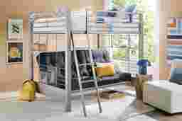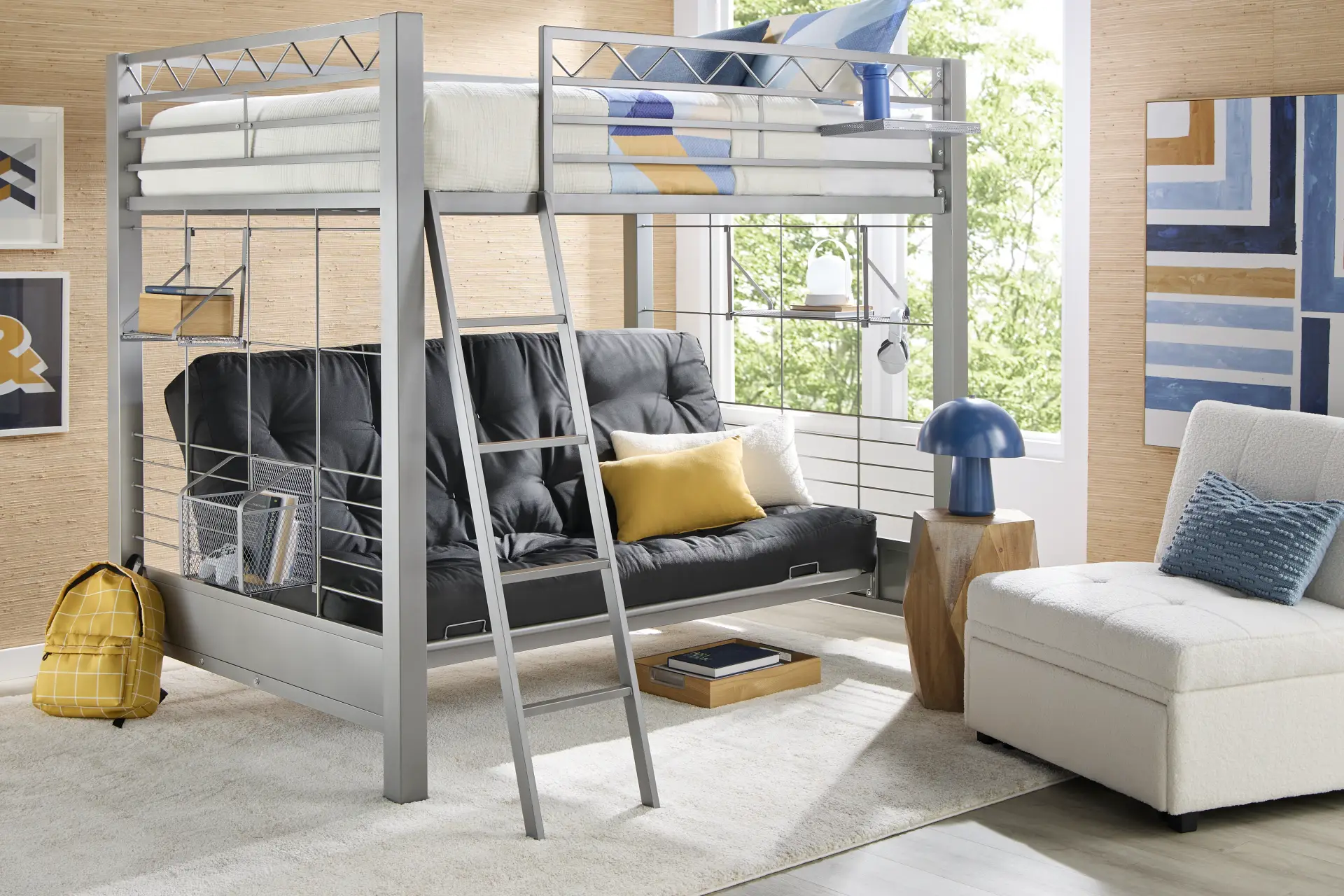 Give your child an ultra-cool sleeping space that they can customize at will! Constructed of metal with a gray finish, the Build-a-Bunk full/futon loft bed adds an instant dash of industrial style with its clean, minimalist look. It has a highly customizable, space-saving design that includes a basket, short bookshelf, long bookshelf, and a tray in a gray finish. Each of these pieces is removable and can be adjusted on the left or right side of the bed, depending on preference or room layout. The futon is a great place for friends to chill, or used as a sleeping space for overnight guests (futon mattress included). You can use the bookshelves for books, trophies, or other trinkets. The basket is a great place to store games or homework close by, and the tray can easily accommodate workbooks or snacks. Mattress and foundation (if required) sold separately.