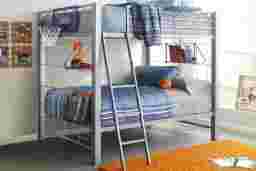 Give your children an ultra-cool sleeping space that they can customize at will! Constructed of metal with a gray finish, the Build-a-Bunk twin/twin bunk bed adds an instant dash of industrial style with its clean, minimalist look. And this bunk is so much more than the typical bunk bed. It has a highly customizable, space-saving design that includes a basket, short bookshelf, long bookshelf, tray and basketball hoop in a bold blue finish. Each of these pieces is removable and can be adjusted on the left or right side of the bunk, depending on preference or room layout. You can use the bookshelves for books, trophies, or other trinkets. The basket is a great place to store games or homework close by, and the tray can easily accommodate workbooks or snacks. The look's real MVP, though, is the basketball hoop. Mattresses and foundations (if required) sold separately.