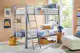 Give your children an ultra-cool sleeping space that they can customize at will! Constructed of metal with a gray finish, the Build-a-Bunk twin/twin bunk bed adds an instant dash of industrial style with its clean, minimalist look. And this bunk is so much more than the typical bunk bed. It has a highly customizable, space-saving design that includes a basket, short bookshelf, long bookshelf, and a tray in a bold blue finish. Each of these pieces is removable and can be adjusted on the left or right side of the bunk, depending on preference or room layout. You can use the bookshelves for books, trophies, or other trinkets. The basket is a great place to store games or homework close by, and the tray can easily accommodate workbooks or snacks. Mattresses and foundations (if required) sold separately.