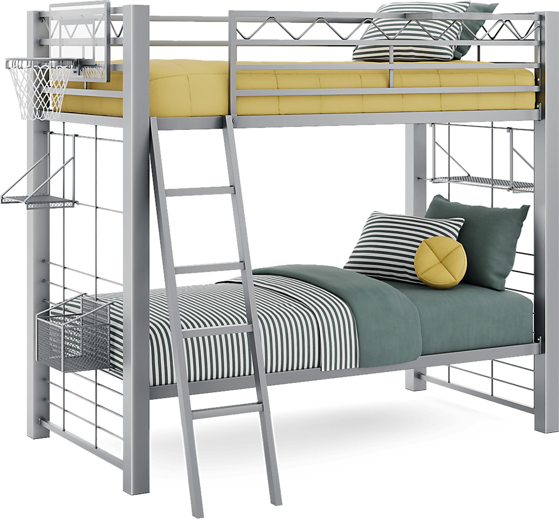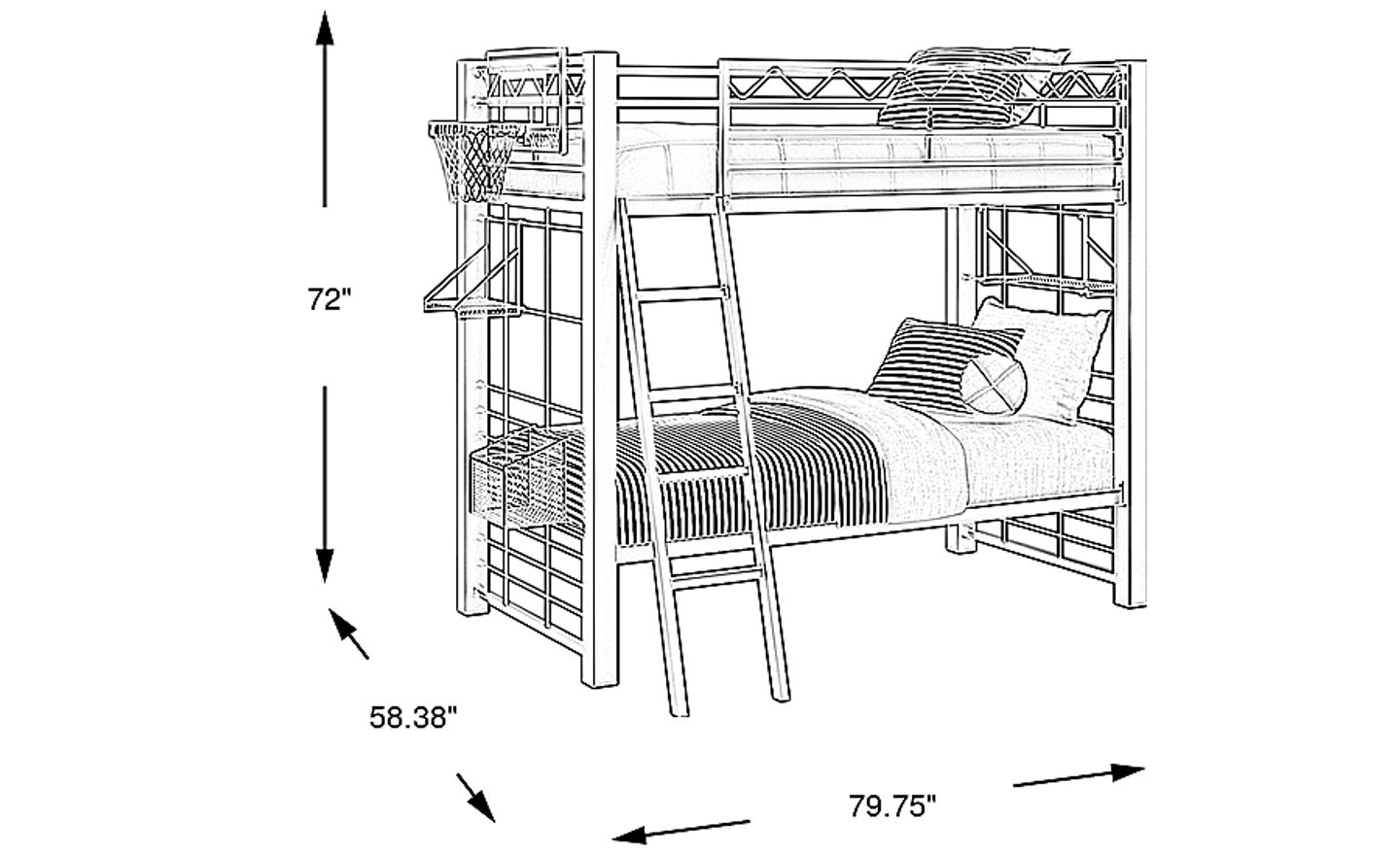 Give your children an ultra-cool sleeping space that they can customize at will! Constructed of metal with a gray finish, the Build-a-Bunk twin/twin bunk bed adds an instant dash of industrial style with its clean, minimalist look. And this bunk is so much more than the typical bunk bed. It has a highly customizable, space-saving design that includes a basket, short bookshelf, long bookshelf, tray and basketball hoop in a gray finish. Each of these pieces is removable and can be adjusted on the left or right side of the bunk, depending on preference or room layout. You can use the bookshelves for books, trophies, or other trinkets. The basket is a great place to store games or homework close by, and the tray can easily accommodate workbooks or snacks. The look's real MVP, though, is the basketball hoop. Mattresses and foundations (if required) sold separately.