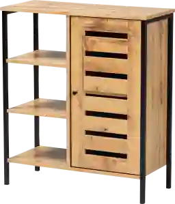 With a compact and stylish design, the Bunkerhill shoe cabinet is a convenient upgrade for busy entryways. Featuring an oak brown finished wood frame supported by sleek black finished metal legs. Three open shelves and two additional shelves behind the door provide space for around five pairs of shoes, depending on size. With a slatted wood door that enables air circulation and prevents odor buildup. An easy solution to entryway storage, this shoe cabinet accommodates the modern home in superb style. Customer assembly is required.