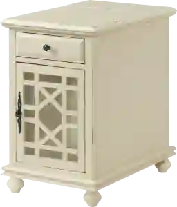 The Bunyard chairside table with power features a beautiful painted finish with sophisticated transitional styling inspired by design cues taken from Parisian antique markets. Each piece is slightly distressed with just the right amount of rub through at the edges to make it seem like this was a piece handed down through generations. With a flip top cover opens up and reveals a power bank with two outlets and USB ports for convenient device charging. One drawer and one cabinet area offer plenty of storage space for books, magazines, and games. A magazine rack is located on the back of the table for extra storage space. The drawer slides out on smooth ball bearing roller guides. The cabinet door features an elegant trellis detail with an intricately cast door pull. Customer assembly is required.