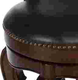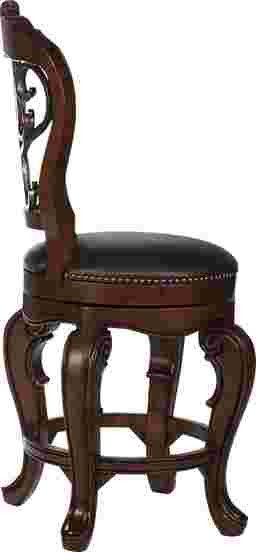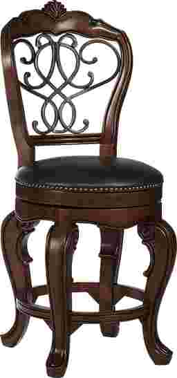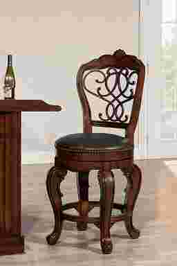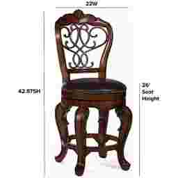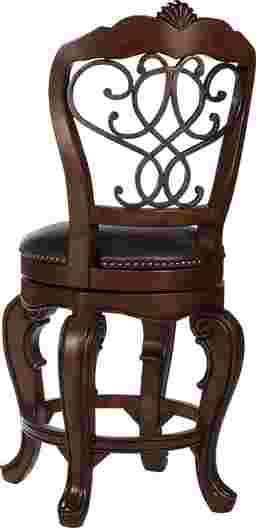 Crafted of wood solids in a rich brown cherry finish with antiqued steel scrolled accents on the seat back, the Burrell counter stool boasts a traditional design that will feel right at home in your dining or entertaining space. A supple brown leather seat cushion adds to the cozy appeal, while nailhead trim and ornate carvings give this swivel stool a sophisticated appearance. Customer assembly is required.
