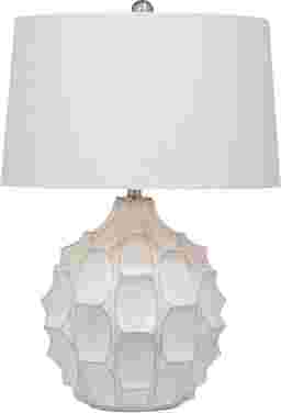 The Butler Tower table lamp features an intricate organic, off white ceramic base. It is paired with a tapered off white linen shade. Customer assembly required.