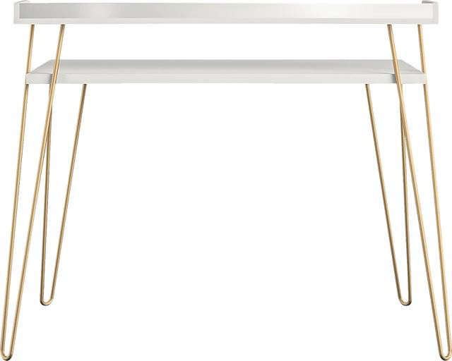 Mix industrial and modern styles together to get the Butterroot desk with riser. This desk is perfect for smaller spaces with its small footprint and offers 2 levels of desk space with the added riser. The white finish coordinates with almost any decor while the laminated particleboard desktop and gold powder-coated metal legs give this desk a sturdy build along with a fun design. Use the Butterroot desk in a home office or create an office space that works for you anywhere in your home. The desktop is large enough to hold your laptop, notebooks, and office essentials while the riser can be used to keep items close by but out of your way. The metal hairpin legs are a fun throwback to popular mid-century design. Desk can hold up to 70 lbs. while the riser can hold 20 lbs. Customer assembly required.