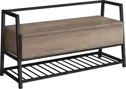 Keep your entryway or hallway clutter free with this Byestreet versatile storage bench. The hinged top lifts to reveal a spacious interior storage cabinet. Under the bench is a shelf for neatly organizing shoes or other items. Conveniently sized and big in functionality, this storage bench in a grey wood-look finish with a black metal frame is brimming with style and substance. Customer assembly is required.