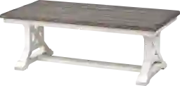 This table is a hallmark of rustic and farmhouse-inspired decor. The combination of the light cream finish and the natural wood grained planks creates a casual, "shabby-chic" or modern-country aesthetic. The trestle base and X-cross leg design provide a structured, architectural look that pairs beautifully with other natural textures like woven rugs, linen-upholstered sofas, or distressed wood accents.