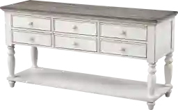 A plank style top with a natural aged patina sets off the paler cream finish that coats the six drawer Bywood console table, a lovely combination The six roomy drawers above provide ample storage space for everything from your table linens and serving pieces, to your pens and art supplies, while the full lower shelf below is perfect for baskets or books. With turned legs and feet, matching hardware and extended drawer glides, this beautiful Console is the perfect choice for your dining room, den or foyer. Customer assembly is required.