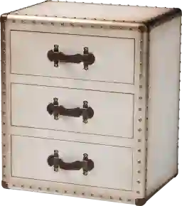 Vintage charm springs forth in the form of the stunning Cabanay white end table. This traditional piece consists of a sturdy wood frame wrapped in smooth canvas. Three drawers offer convenient storage for household essentials while reserving the tabletop for daily use. The Cabanay is affixed with metal bands studded with nail heads for an extra dose of industrial charm. Faux leather handles complete the look, making the Cabanay an eccentric addition to any setting.