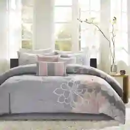 This set provides a complete design solution for your bedroom. It includes one California King comforter, two matching shams, one solid bed skirt for a clean finishing touch, and three decorative pillows. The pillows feature embroidered details and fabric manipulation to add professional-level dimension and texture to your bed.